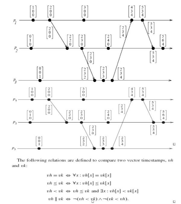 - 更重要的是,接收者可以得知进程Pi发送消息m之前其他进程已经发生了多少个事件。换句话说,消息m的时间戳vt告诉接收者其他进程中有多少事件发生在它之前,并且消息m可能在因果关系上依赖于这些事件。