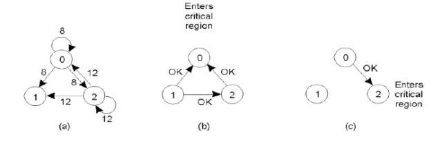 - (c) 当进程0退出临界区时,它发送一个OK消息,所以进程2现在可以进入临界区