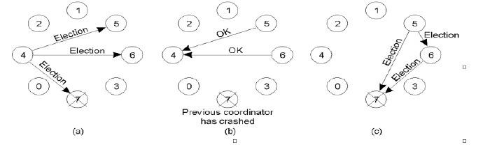 - (b) 进程5和6进行响应,告诉进程4停止选举;