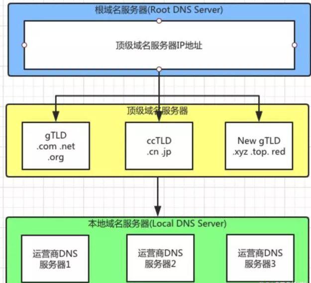 如图1 所示,DNS域名服务器分为三级,从上到下分别是根域名服务器(Root DNS Server)、顶级域名服务器(gTLD、ccTLD、New gTLD)、本地域名服务器(Local DNS Server)。