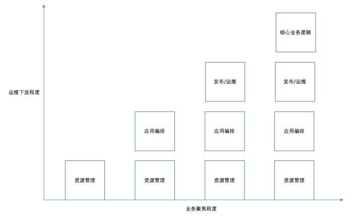 从左至右,通过下放不同层次的运维工作,降低「部署&运维」成本。在降低了运维工作成本后,在「通用逻辑」层面降低成本。二者结合起来,在迭代过程中更深入聚焦业务。该过程也是从 Cloud Hosting 到 Cloud Native 的过程,充分享受云原生带来的技术红利。