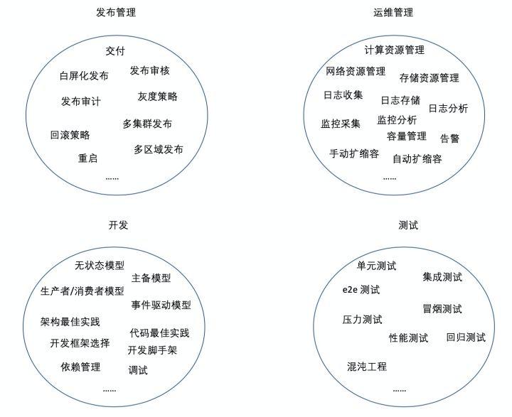 在开发方面,交付时可以采用镜像,也可以采用语言层面的打包 (如 Java 中的 war/jar) ,由平台负责运行时相关的工作。还可以更进一步,采用 FaaS 的理念,依托于平台或标准化 FaaS 解决方案,只提供业务逻辑函数,由平台负责请求入口、请求调用和自动弹性伸缩等运行时事宜。