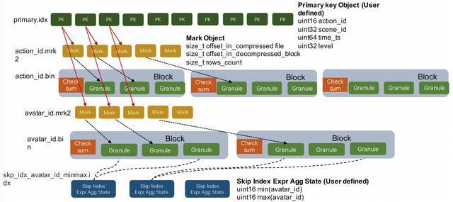 2 Mark标识文件:action_id.mrk2、avatar_id.mrk2等都是列存文件中的Mark标记,Mark标记和MergeTree列存中的两个重要概念相关:Granule和Block。