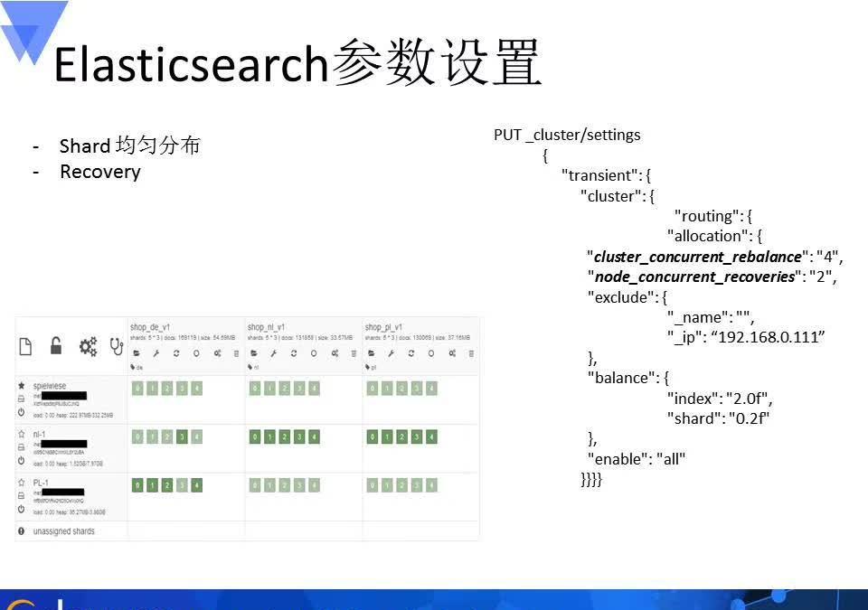 这里就是讲输入到ElasticSearch里面每个集群的一些参数,一些相对比较主要的一些参数。这里的参数配了一幅图,这幅图最想表明的意思是说,我的参数的配置要使得我从整个集群的角度上来看,它每一台机器上的shard数目基本是相当的。