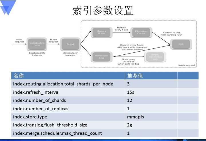 这是具体到一个索引参数的设置。在讲具体参数之前,我们可以先讲一下ElasticSearch索引参数的设置、输入以及中间发生的过程。当真正的数据请求到达ElasticSearch节点之后,它一方面会写入到内存中,另外一部分会写入到TransactionLog。