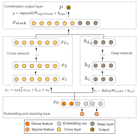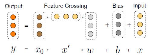 在《Deep & Cross Network for Ad Click Predictions》[4]这篇论文里直接提到了 FM、FFM 类的算法由于参数爆炸无法生成并处理高阶特征组合的问题。如图 5 所示采用了一种比较巧妙的方式进行特征组合,在 DCN 的每一层 cross net 中,参数 w 是一个 n *1 维的向量(n 为交叉特征的维数),随着层数 k 的增长,参数是以 O(k *n)的速度增长,通过这样的设计,Order-3、Order-4 甚至更高阶的特征组合并不会带来参数的爆炸。当然这里还是会有一些信息损失,与 DeepFM 相比较,每个交叉特征的参数并非完全独立。