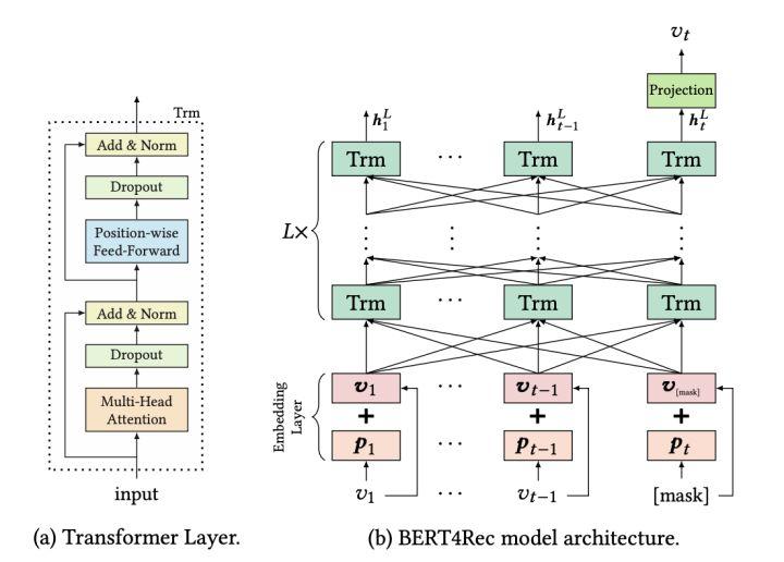 BERT 也被应用到了推荐场景,在《BERT4Rec-Sequential Recommendation with Bidirectional》[10]中问题被定义为基于用户的历史行为序列来预测下一个物品。文中使用 BERT 来处理用户的行为序列,可以说是一种比较“完美”的结构,在序列推荐中,个人认为很难再有模型在结构上能超越 BERT。不过在该文中,用户侧的特征和场景的特征没有被应用起来,只是用了用户行为序列,这一点其实也值得探索。和基于 Transformer 的推荐类似,序列推荐的五个挑战中,前三个能够很好的解决,后两个问题从结构上看也不能很好的解决。
