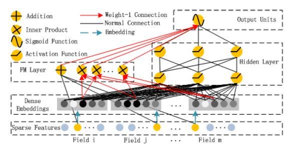 在 Wide&Deep 的模型中,Wide 侧 0-1 离散特征的交叉组合带来了很好的效果,但需要人工进行特征工程。在 2017 年发表的《DeepFM:A Factorization-Machine based Neural Network for CTR Prediction》[3]的模型中,离散特征经过 Embedding 层后获得的低维稠密向量,通过在 FM Layer 进行两两的 Inner product 操作实现了 Order-2 的特征组合。DeepFM 的应用,使得这个模型基本不需要特征工程,而且性能在某些数据集上超过了 Wide&Deep 模型。