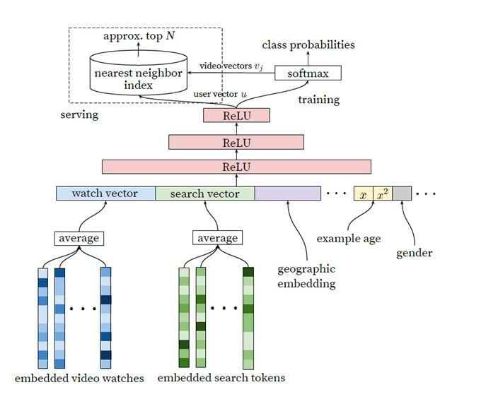 谷歌在《Deep Neural Networks for YouTube Recommendations》[2]论文中提出的召回模型不仅算法具有创新性,而且在大规模召回的工业场景中非常实用。通过抽取最后一层的用户向量和视频向量,配合高效的近邻搜索算法,可以实现工业级的在线大规模召回。这篇论文有更多的技术细节值得深究,可参考知乎的一些解读,这里不在赘述。
