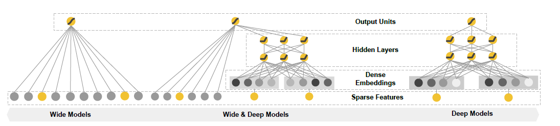 在《Wide & Deep Learning for Recommender Systems》[1]中,Wide 侧使用的是线性结构 y= w*x +b,通过对 0-1 离散特征的交叉组合,模型可以非常有效地学到这部分可解释性非常强的信息。Deep 侧则采用了 Embedding+MLP 的结构,通过 Embedding 把稀疏高维离散特征转化成了低维稠密的连续特征,并将该特征和连续类特征拼接在一起放入 MLP 层,通过 MLP 的非线性处理能力去发现线性模型无法捕捉的更深层次特征组合效应。两部分模型的联合使用带来了超越传统模型的效果。