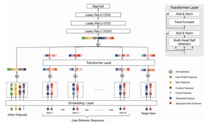 Transformer 也被应用到了推荐领域,阿里巴巴发表的《Behavior Sequence Transformer for E-commerce Recommendation in Alibaba》[9]通过 Transformer 抽取用户行为序列中的信息,并与其他特征拼接到一起放入 MLP 层,最终建模成一个二分类问题。当然这里做了一些适配,比如原始版本的 Transformer 中使用了 positional embedding 来捕捉句子中的顺序信息,在推荐中,作者使用了物品曝光时间与点击时间之间的差作为“positional embedding”的输入。在文中,Transformer 的输入层只使用了物品的 item_id 和 category_id 作为特征。回顾上文描述的五个挑战,基于 Transformer 的推荐可以很好的解决前三个挑战,后两个问题,从网络结构上来看,并不能很好的解决。