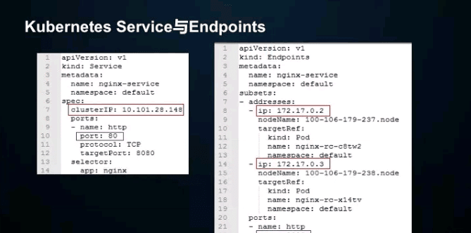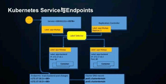 图中是一个 Replication Controller 部署出来 2 个 pod 所对应的 Service。我们知道 RC 和 pod 的关系是通过 label-selector 来关联的,service 也是一样,通过 Selector 来匹配它所要做负载均衡的 Pod。实际上这中间还有一个对象,叫做 Endpoint,为什么要有这个对象呢?因为在实际应用中,一个 pod 被创建,并不代表它马上就能对外提供服务,而这个 pod 如果将被删除,或处于其他不良状态,我们都希望客户端的请求不被分发到这个无法提供服务的 pod 上。Endpoint 的引入,就是用来映射那些能对外提供服务的 pod。每个 Endpoints 对象的 IP 对应一个 Kubernetes 的内部域名,可以通过这个域名直接访问到具体的 pod。