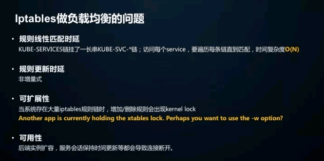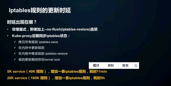 再者,kube-proxy 会周期性的刷新 Iptables 状态:先 iptables-save 拷贝系统 Iptables 状态,然后再更新部分规则,最后再通过 iptables-restore 写入到内核。当规则数到达一定程度时,这个过程就会变得非常缓慢。