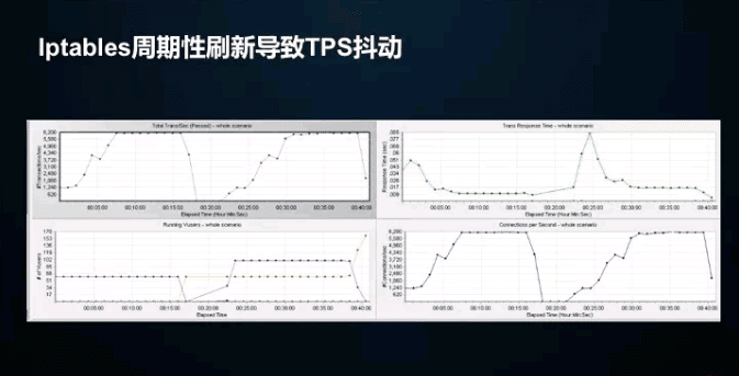 上图就说明了在高并发的 loadrunner 压力测试下,kube-proxy 周期性刷新 Iptables 导致后端服务连接断开,TPS 的周期性波动。