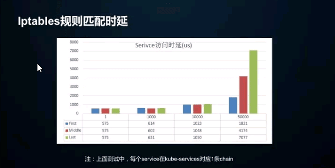 上图说明了 Service 访问时延随着规则数的增加而增长。但其实也还能接受,因为时延最高也就 8000us(8ms),这说明真正的性能瓶颈并不在这里。