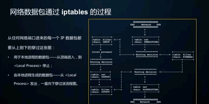 这是 IPtables 处理网络包的一个流程图,可以看到,每个包进来都会按顺序经过几个点。首先是 PREROUTING,它会判断接收到的这个请求包,是访问本地进程还是其他机器的,如果是访问其他机器的,就要走 FORWARD 这个 chain,然后再会做一次 Routing desicion,确定它要 FORWARD 到哪里,最后经 POSTROUTING 出去。如果是访问本地,就会进来到 INPUT 这条线,找到对应要访问哪个本地请求,然后就在本地处理了。处理完之后,其实会生成一个新的数据包,这个时候又会走 OUTPUT,然后经 POSTROUTING 出去。
