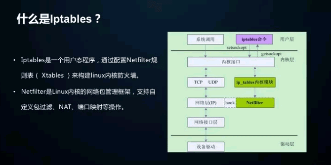 Iptables 主要分两部分,一个是它的命令行工具,在用户态;然后它也有内核模块,但本质上还是通过 Netfilter 这个内核模块来封装实现的,Iptables 的特点是支持的操作比较多。