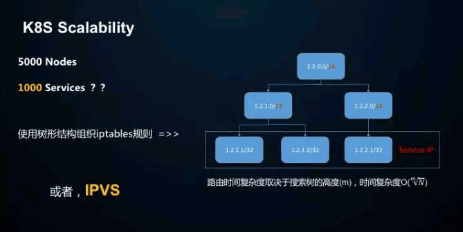 在这个例子中,树根是 16 位地址,根的两个子节点是 24 位地址,虚 IP 作为叶子节点,根据不同的网段,分别挂在不同的树节点下。这样,规则匹配的时延就从 O(N) 降低到 O(N 的 M 次方根),M 即树的高度。但这么做带来的代价是 Iptables 规则变得更加复杂。