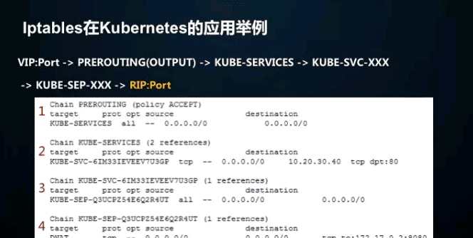 那么,在 Kubernetes 里面是怎么用 Iptables 来实现负载均衡呢?来看一个实际的例子。在 Kubernetes 中,从VIP到RIP,中间经过的Iptables链路包括:PREROUTING/OUTPUT(取决于流量是从本机还是外机过来的)-> KUBE-SERVICES(所有 Kubernetes 自定义链的入口)->KUBE-SVC-XXX(后面那串 hash 值由 Service 的虚 IP 生成)->KUBE-SEP->XXX(后面那串 hash 值由后端 Pod 实际 IP 生成)。