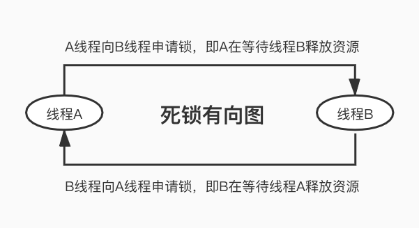 在计算机中也可以用有向图来描述死锁问题,首先假定每个线程为有向图中的一个节点,申请锁的线程A为起点, 拥有锁的线程B为终点,这样就形成线程A到线程B的一条有向边,而众多的锁(边)和线程(点), 就构成了一个有向图。