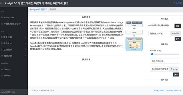以图搜图的演示界面如下图所示, 用户可以将本地图片批量的导入AnalyticDB作为搜索的目标相册. 用户可以通过选择本地图片或填写网络图片的URL来进行以图搜图. 同时, 用户可以选择需要返回最相似的图片数目。