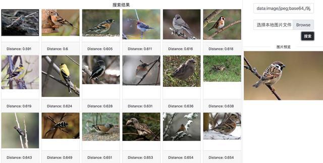 我们提前向AnalyticDB中导入了近50000张图片. 如下图所示, 我们使用一张鸟类的图片进行以图搜图(右侧图片预览), 可以看到返回的全部都是相似的鸟类的照片. 每张照片下方显示了与查询图片的特征的距离, 距离越近表示越相似。