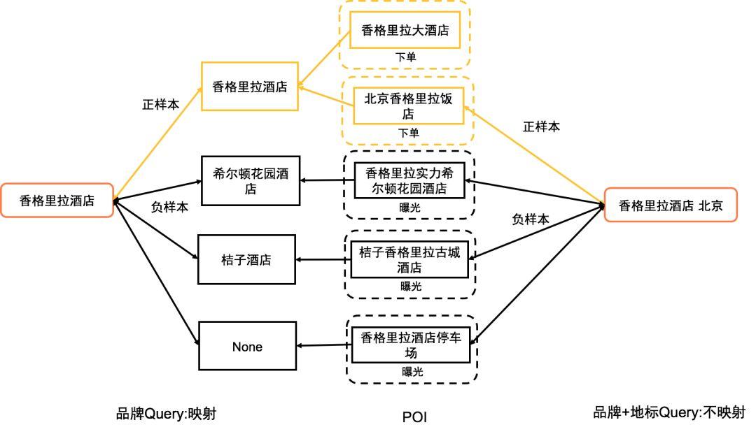 正样本从用户下单的POI中进行随机采样,且过滤掉Query只出现在POI的分店名中的样本,如<大润发,小龙坎老火锅(大润发店)>,虽然Query和POI字面匹配,但其实是不相关的结果。