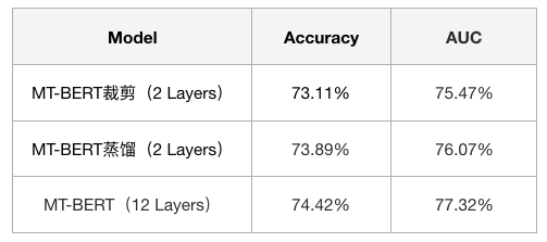 在Query意图分类任务[2]中,我们基于MT-BERT裁剪为4层小模型达到了上线要求。意图分类场景下Query长度偏短,语义信息有限,直接裁剪掉几层Transformer结构对模型的语义表征能力不会有太大的影响。在美团搜索的场景下,Query和Doc拼接后整个文本序列变长,包含更复杂的语义关系,直接裁剪模型会带来更多的性能损失。因此,我们在上线Query-Doc相关性模型之前,采用知识蒸馏方式,在尽可能在保持模型性能的前提下对模型层数和参数做压缩。两种方案的实验效果对比见下表1:
