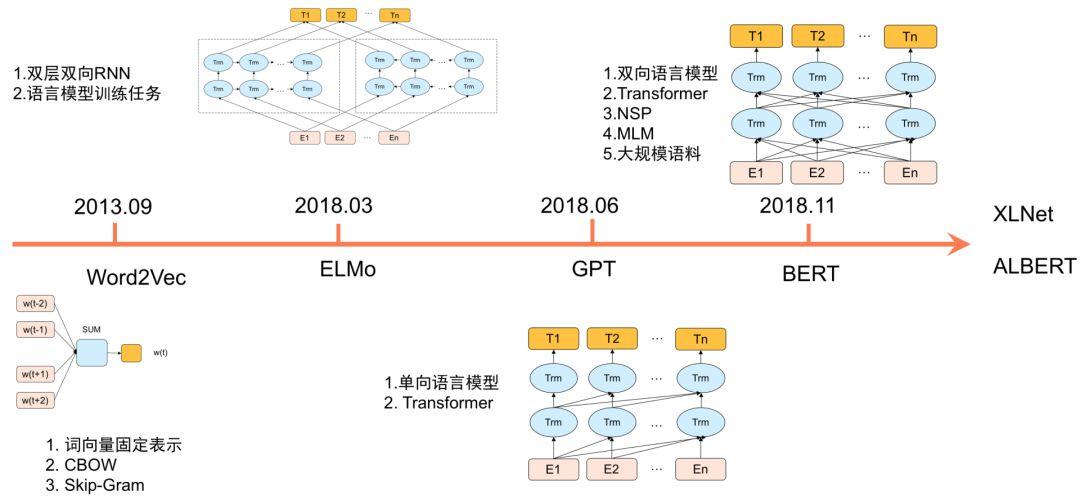 相比RNN模型,Transformer语义特征提取能力更强,具备长距离特征捕获能力,且可以并行训练,在机器翻译等NLP任务上效果显著。Open AI团队的GPT[7]使用Transformer替换RNN进行深层单向语言模型预训练,并通过在下游任务上Fine-tuning验证了Pretrain-Finetune范式的有效性。在此基础上,Google BERT引入了MLM(Masked Language Model)及NSP(Next Sentence Prediction,NSP)两个预训练任务,并在更大规模语料上进行预训练,在11项自然语言理解任务上刷新了最好指标。BERT的成功启发了大量后续工作,总结如下: