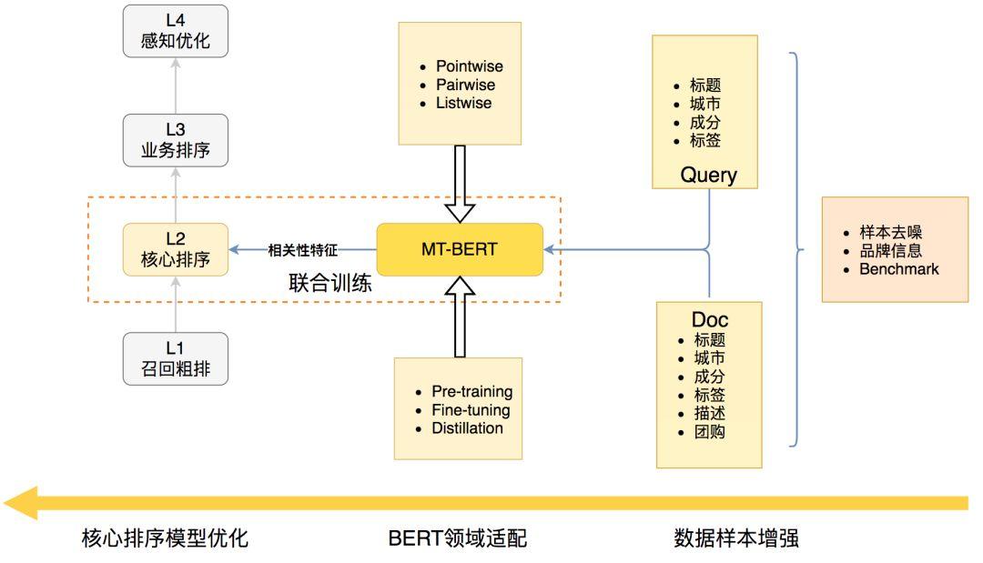 Feature-based方式是经过BERT得到Query和Doc的表示向量,然后计算余弦相似度,所有业务场景下Query-Doc相似度都是固定的,不利于适配不同业务场景。此外,在实际场景下为海量Doc向量建立索引存储成本过高。因此,我们选择了Finetune-based方案,利用搜索场景中用户点击数据构造训练数据,然后通过Fine-tuning方式优化Query-Doc语义匹配任务。图2展示了基于BERT优化美团搜索核心排序相关性的技术架构图,主要包括三部分: