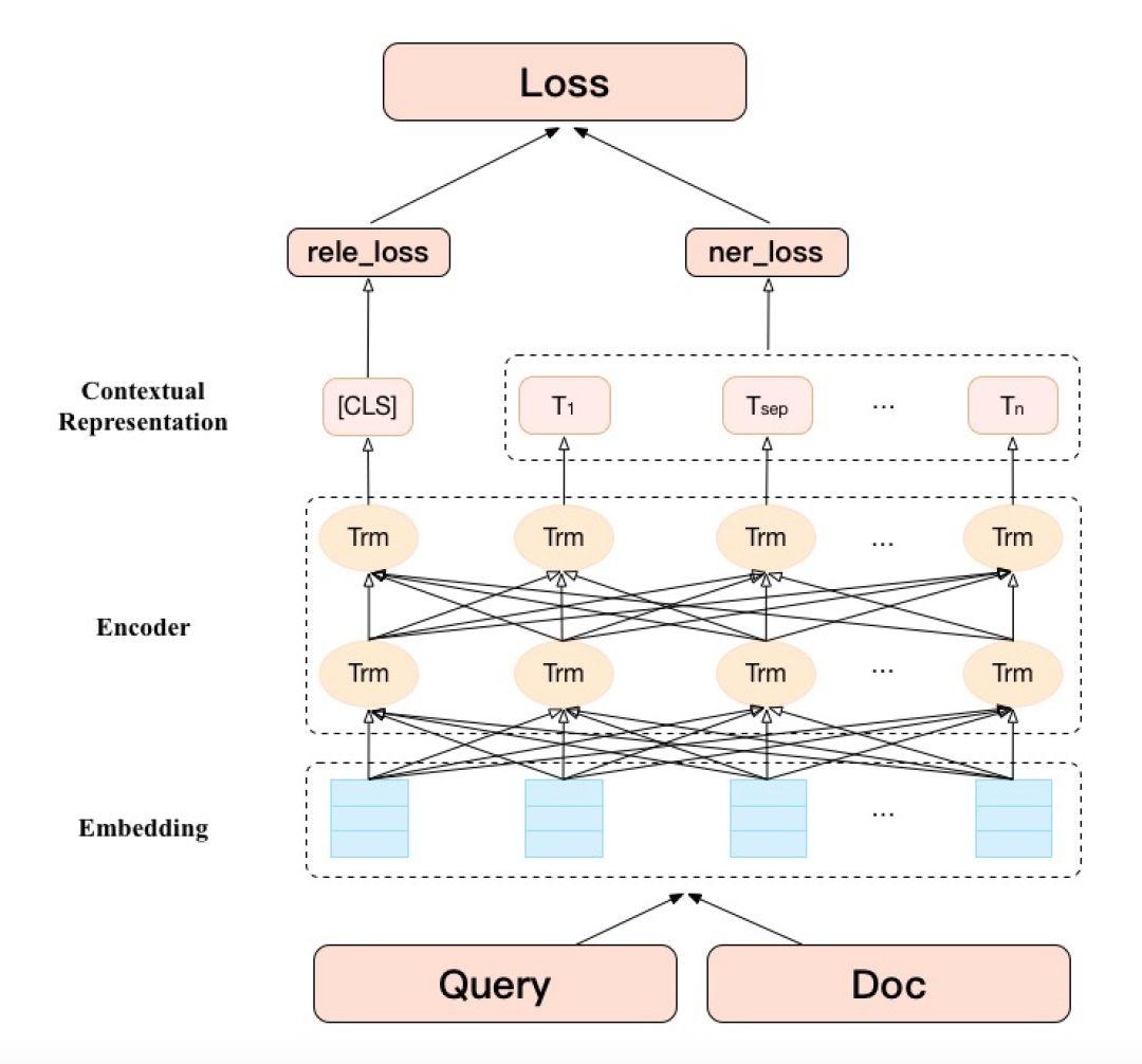 在美团搜索场景中,Query和Doc通常由不同实体成分组成,如美食、酒店、商圈、品牌、地标和团购等。除了文本语义信息,这些实体成分信息对于Query-Doc相关性判断至关重要。如果Query和Doc语义相关,那两者除了文本语义相似外,对应的实体成分也应该相似。例如,Query为“Helens海伦司小酒馆”,Doc为“Helens小酒馆(东鼎购物中心店)”,虽然文本语义不完全匹配,但二者的主要的实体成分相似(主体成分为品牌+POI形式),正确的识别出Query/Doc中的实体成分有助于相关性的判断。微软的MT-DNN[33]已经证明基于预训练模型的多任务Fine-tuning可以提升各项子任务效果。由于BERT Fine-tuning任务也支持命名实体识别(NER)任务,因而我们在Query-Doc相关性判断任务的基础上引入Query和Doc中实体成分识别的辅助任务,通过对两个任务的联合训练来优化最终相关性判别结果,模型结构如下图5所示: