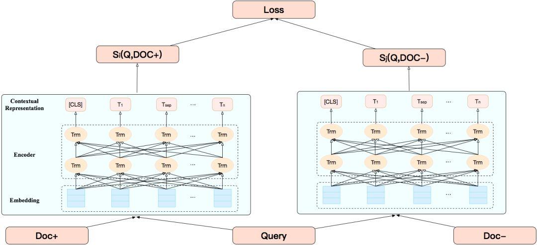 对于同一Query的候选Doc,选择两个不同标注的Doc,其中相关文档记为Doc+,不相关文档记Doc-。输入层通过Lookup Table 将Query, Doc+以及Doc-的单词转换为 Token 向量,同时会拼接位置向量和片段向量,形成最终输入向量。接着通过BERT模型可以分别得到(Query, Doc+)以及(Query, Doc-)的语义相关性表征,即BERT的CLS位输出。经过Softmax归一化后,可以分别得到(Query, Doc+)和(Query, Doc-)的语义相似度打分。
