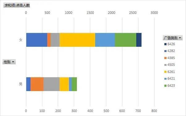 可以看出,大部分类别中,女性的广告点击数都要明显大于男性的点击人数。