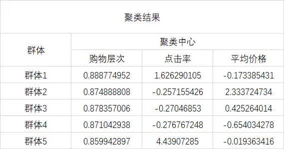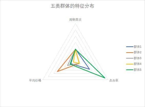 根据用户在购物深度、点击率、观看广告商品的平均价格3个维度的表现,将用户划分为5类客户。