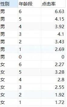 来看看不同年龄段、不同性别的用户点击率有什么差异
