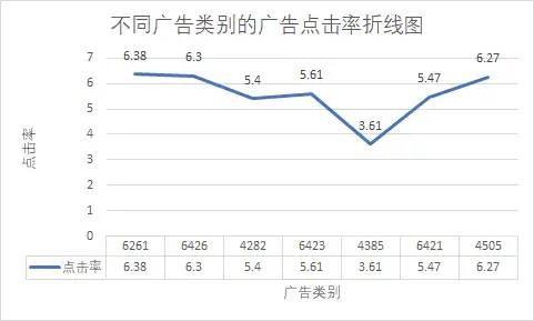 可以看出类别6261广告的展示数、点击数、点击率均为最高,而类别4385广告的展示数虽然有10000+,但是点击数、点击率却是最低的。