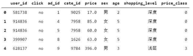 对于广告商品价格字段,每个广告的商品都有各自的价格,根据价格字段不便于进行统计。新增一个字段“price_class”代表价格的区间。