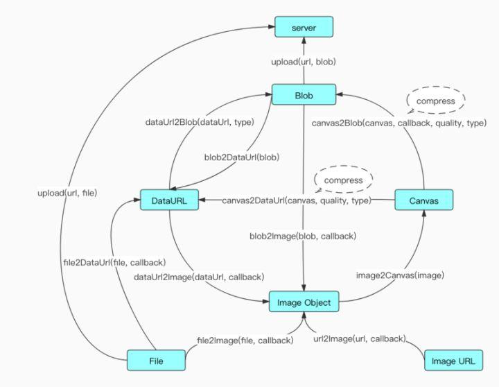 在实际应用中有可能使用的情境:大多时候我们直接读取用户上传的 File 对象,读写到画布(canvas)上,利用 Canvas 的 API 进行压缩,完成压缩之后再转成 File(Blob) 对象,上传到远程图片服务器;不妨有时候我们也需要将一个 base64 字符串压缩之后再变为 base64 字符串传入到远程数据库或者再转成 File(Blob) 对象。一般的,它们有如下转化关系: