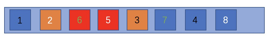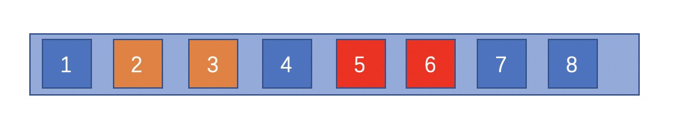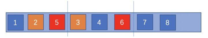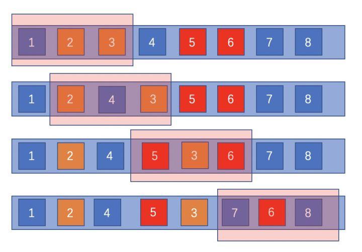 以上两种,都是在我们彻底考虑全局后产生的算法,复杂度计算中n的变量也是整个原序列大小,但是,实际场景中,用户并不会一下看到整个序列,往往一次返回topN个,填满用户窗口就可以了。 这个时候,我们应当发掘一种只参考局部的方法,基本思想就是滑动窗口。 如下图所示,我们开启一个size为3的窗口,以此来类比用户的接收窗口,规定窗口内不能有元素重复,即模拟用户看到的一个展示页面没有重复,如果窗口内发现重复元素,则往后探测一个合适的元素与当前元素交换。 在第一步时,我们探测到2、3同类,于是将3拿出来,往后探测到4符合3处的要求,于是交换3、4,窗口往后滑动一格。 第二步时,发现还存在窗口中2、3同类,再将3、5交换,窗口往后滑动一格,发现窗口内无冲突,再滑动一格。 第三步时,发现5、6同类,将6、7交换,窗口滑动到最后,尽管还发现了7、8同类,但彼时已无可交换元素,便不作处理。