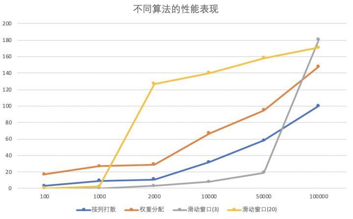 可以看出,在一定数据范围内,滑动窗口法拥有极大的优势,但是性能与窗口大小也有极大关系,如果窗口范围过大,冲突就多,交换速度会极大下滑。