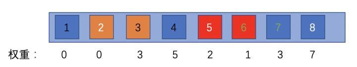 其中,W为人为为每个属性分配的系数,代表着打散的优先度,而Count则代表着该对象在此属性的表现(相同属性已经出现了多少次)。直观的来说,相似属性已经出现了越多次,权重值就会越大,并且在函数计算过程中,天然考虑了原本顺序的因素,所以计算出权重后,无须其他处理,只需要按权重排序即可。 以下图为例,如果我们规定字体颜色权重系数为2,色块颜色权重系数为1 那么,在1、2号,他们的字体颜色和色块都没出现过,则权重为0,到3号时,都出现过1次,则权重为 2 * 1 + 1 * 1 = 3,以此类推,8号时,其字体颜色出现过2次,色块颜色出现过3次,则权重为 2 * 2 + 1 * 3 = 7