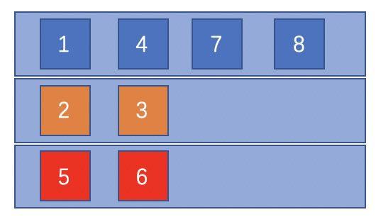 既然要避免相似属性的内容在呈现时相邻,很直接的思路是我们将不同属性的装在不同的桶里,每次要拿的时候尽量选择不同的桶。这样就可以实现将元素尽量打散。 如下图所示,在这个例子中,初始的列表是共有三类(蓝、黄、红):