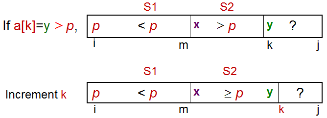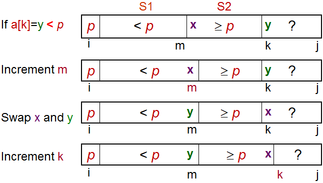 // a[low..high] ~> a[low..m–1], pivot, a[m+1..high]