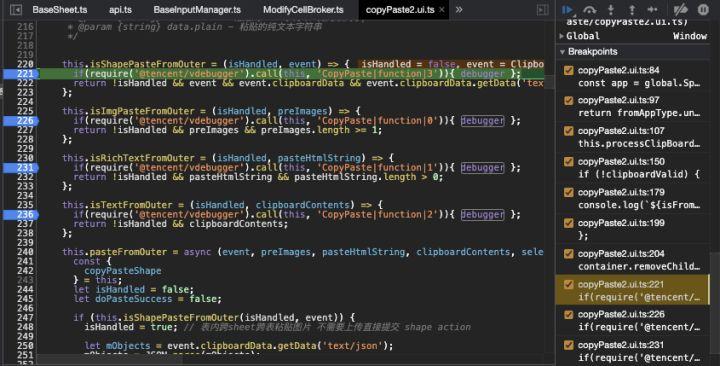 }上面这段代码是当用户反馈一个复制粘贴问题的时候,熟悉该模块的负责人根据用户的反馈,知道用户是外部粘贴出现了问题,由于他对该模块熟悉,他会快速的在浏览器的控制台打断点,或者手动在源代码注入 debugger 关键词去一步一步定位用户的问题,他会先检查内部粘贴 pasteFromOuter 是否触发了,然后检查函数 isShapePasteFromOuter 是否运行成功,出参和入参是否正确,是否代码走歪了,去了 isImgPasteFromOuter。