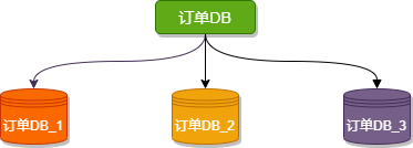 例如下图,订单DB_1、订单DB_1、订单DB_3 三个数据库内有完全相同的表 order,我们在访问某一笔订单时可以通过对订单的订单编号取模的方式 订单编号 mod 3 (数据库实例数) ,指定该订单应该在哪个数据库中操作。