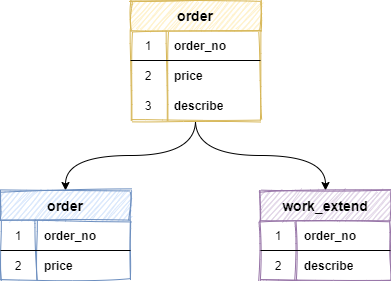 例如:一张 order 订单表,将订单金额、订单编号等访问频繁的字段,单独拆成一张表,把 blob 类型这样的大字段或访问不频繁的字段,拆分出来创建一个单独的扩展表 work_extend ,这样每张表只存储原表的一部分字段,再将拆分出来的表分散到不同的库中。