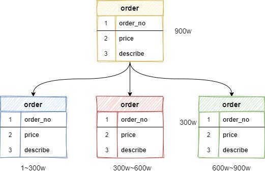 例如:一张 order 订单表有 900万数据,经过水平拆分出来三个表,order_1、order_2、order_3,每张表存有数据 300万,以此类推。