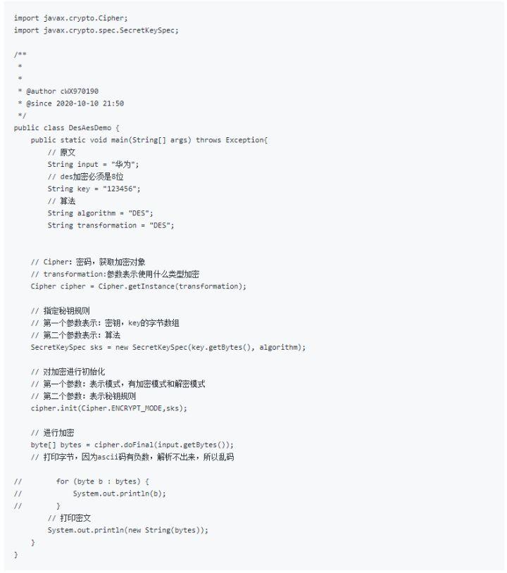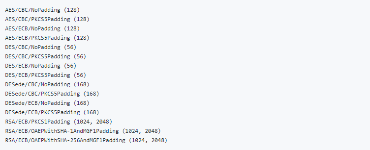 Cipher :文档 https://docs.oracle.com/javase/8/docs/api/javax/crypto/Cipher.html#getInstance-java.lang.String-