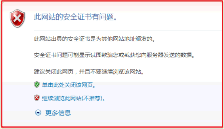 如果数字证书记载的网址,与你正在浏览的网址不一致,就说明这张证书可能被冒用,浏览器会发出警告。