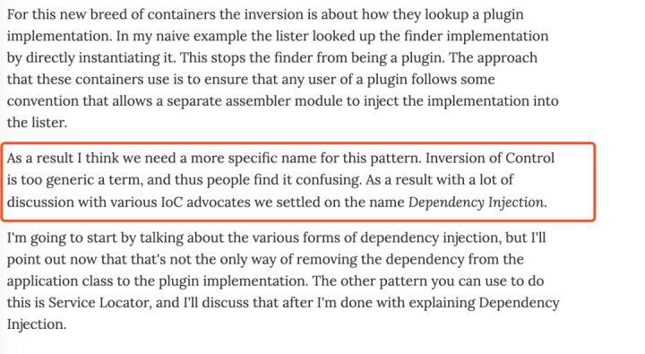并且,老马(Martin Fowler)在一篇文章中提到将 IoC 改名为 DI,原文如下,原文地址:https://martinfowler.com/articles/injection.html 。